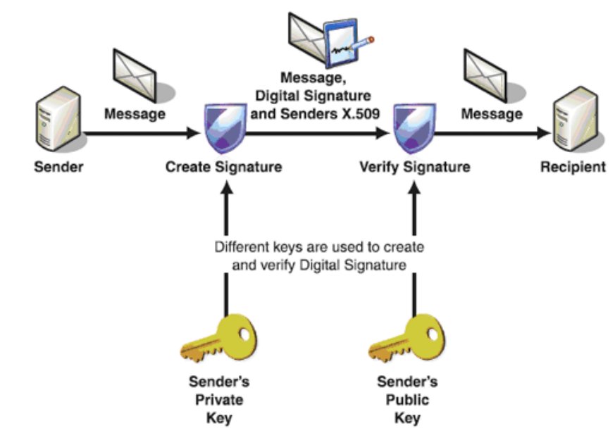그래서 수신자에게 데이터를 전송할 때 인증서, 송신자의 X.509 인증서(전자 서명)와 암호화된 메시지가 전송된다.