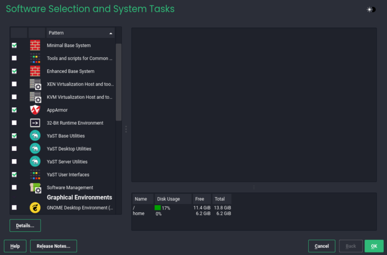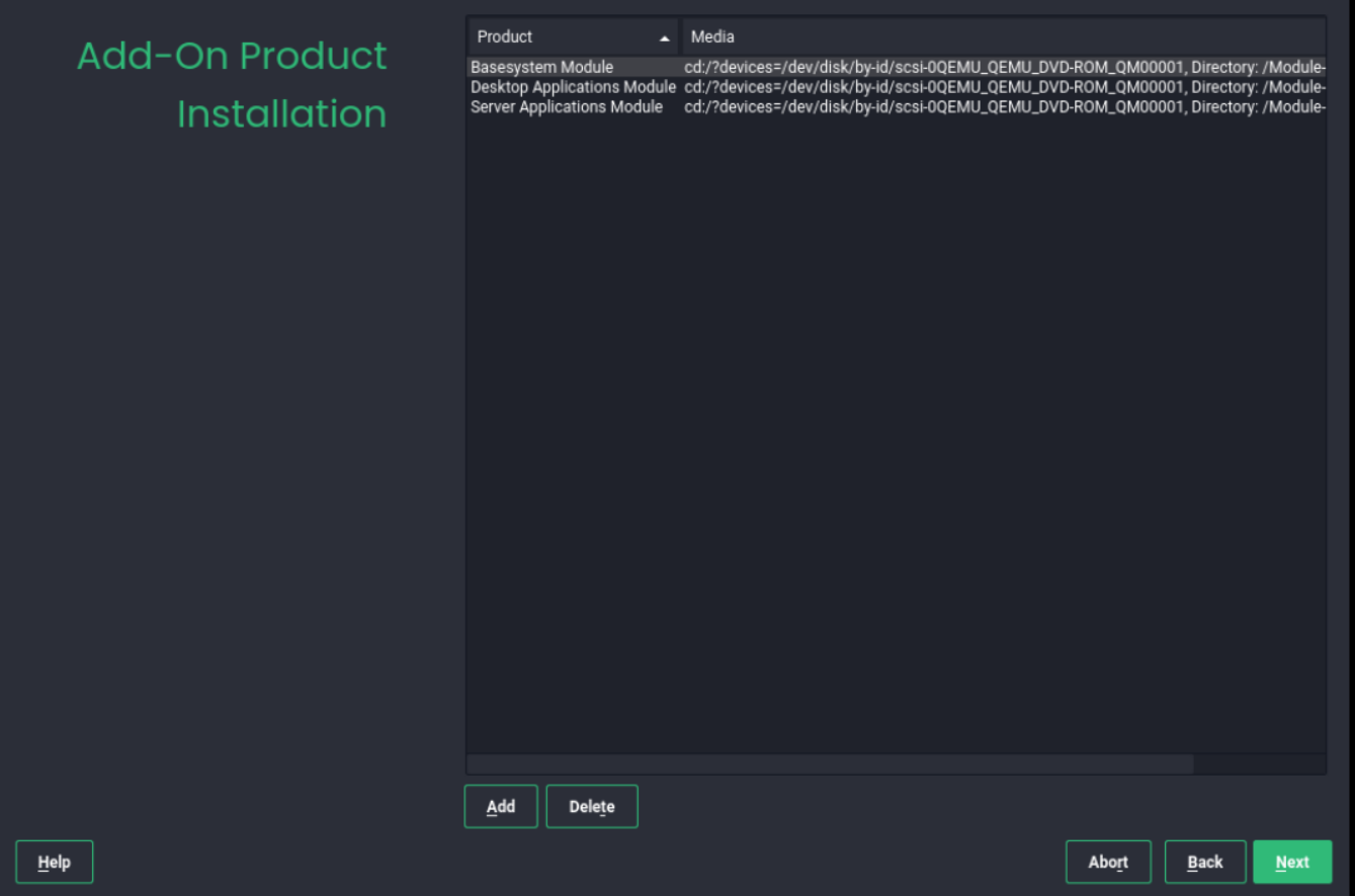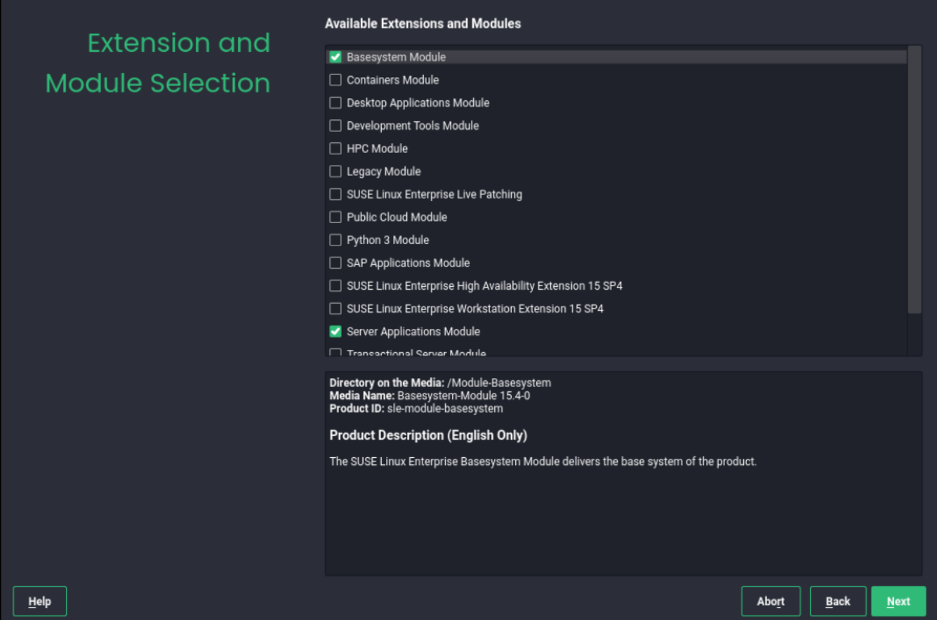 시스템이 성공적으로 등록되면 설치 프로그램이 SUSE Linux Enterprise Server 에 사용할 수 있는 모듈 및 확장을 나열합니다 . 모듈은 필요에 따라 제품을 구성할 수 있는 구성 요소입니다. 그들은 무료입니다. 확장 기능은 제품에 기능을 추가합니다. 구독으로 제공되며 비용을 지불해야 하는 등록 키가 필요합니다. 모듈 선택은 설치 및 실행 중인 시스템에서 사용할 수 있는 소프트웨어 소스(리포지토리)를 정의하기 때문에 설치 범위에 간접적으로 영향을 미칩니다. 밑에 나오는 표는 선택하실 수 있는 모듈에 관한 설명입니다.