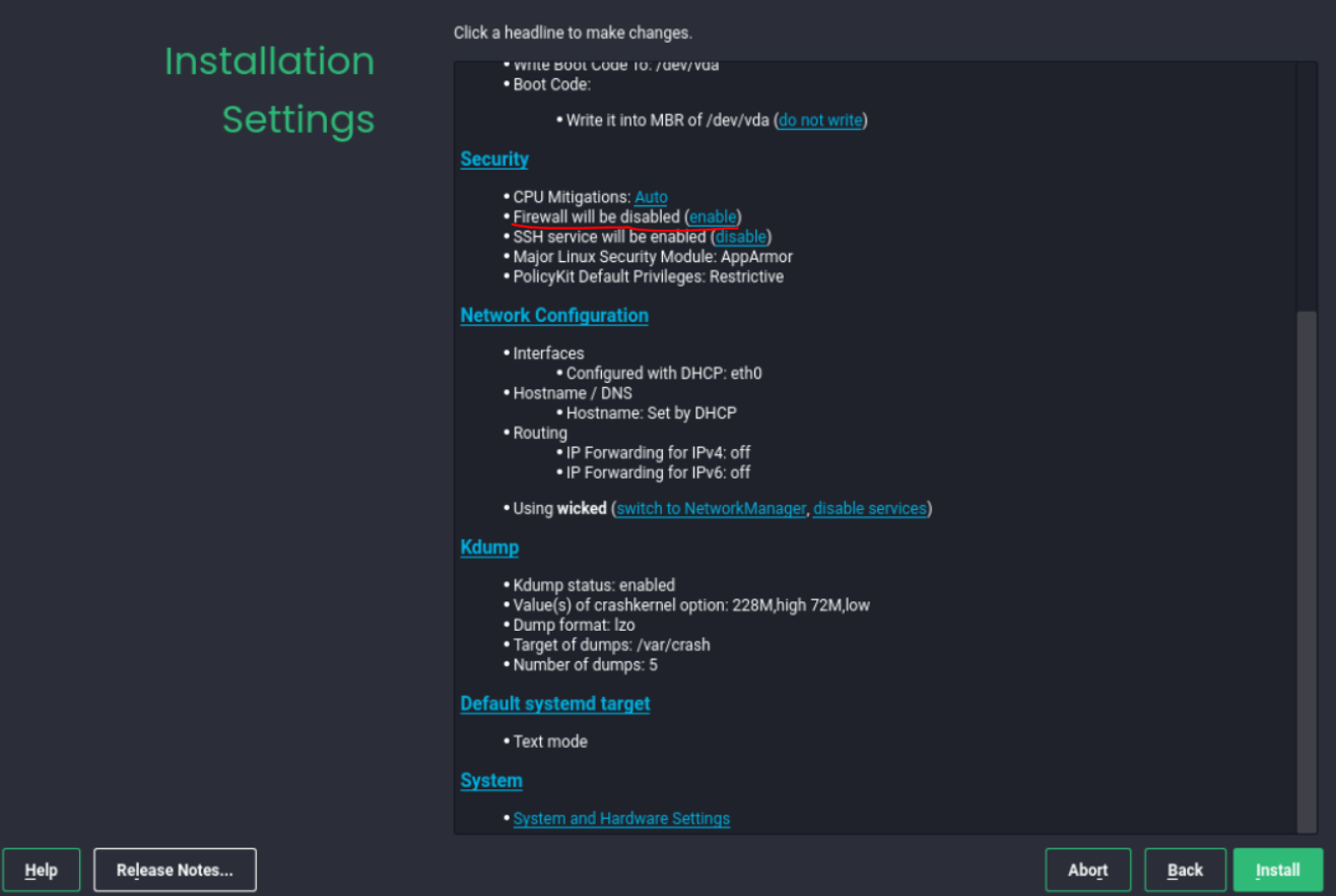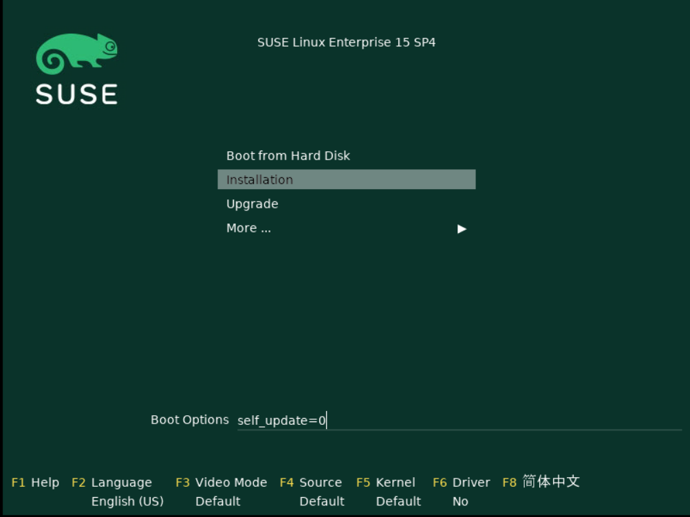 처음에 설치를 하게 되면, 이와 같은 화면이 나타납니다. 바로 install을 해도 문제가 없습니다. 만약 신속한 설치를 원하신다면, 선택할 수 있는 옵션이 사진에 나와 있습니다. 바로 self_update=0 입니다. sles는 잠재적인 버그 혹은 update를 설치 시 자동으로 하게 되어있게끔 만들어졌습니다. 문제는, 이 동작을 수행하면 설치가 오래 걸리게 됩니다. 이러한 과정을 겪지 않고 싶으시다면 self_update=0를 입력하면 되겠습니다.