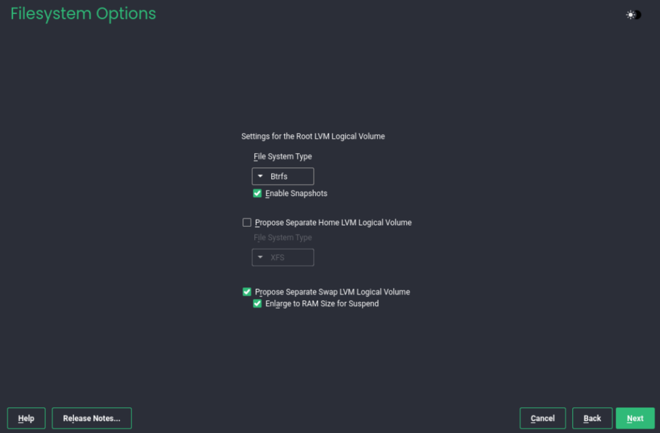 파일시스템을 선택할 수 있는 설정이 나타납니다. 기본적으로 btrfs가 선택되어 있습니다. 그렇기에 Snapshot이 가능하다는 표시가 나타납니다. 다른 파일시스템을 클릭하면, 이 부분이 회색창으로 나오는 불가능하다는 메시지를 전합니다.