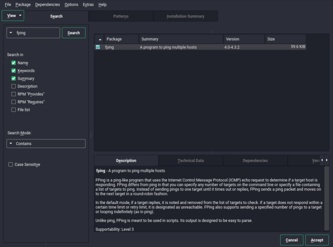 fping을 클릭하면 체크박스에 체크가 표시 됩니다. 그리고 fping을 설명하는 글도 확인 할 수 있습니다. 최종 확인 후