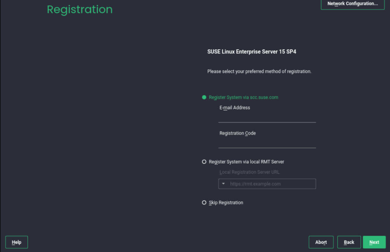 SUSE 고객 센터에 등록하려면 SCC 계정과 연결된 전자 메일 주소와 SUSE Linux Enterprise Server의 등록 코드를 입력합니다. 3개의 항목 중 기본 값으로 선택 되어 있습니다.