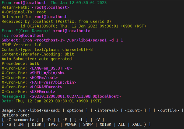 | 스크린샷을 했는데 가독성이 너무 안 좋아서 텍스트로 가져왔다. host-1:~ # journalctl -n 5 Feb 13 12:40:01 host-1 postfix/pickup[129158]: 6E4E7133A9EB: uid=0 from=<root> Feb 13 12:40:01 host-1 postfix/cleanup[129360]: 6E4E7133A9EB: message-id=<20230213034001.6E4E7133A9EB@localhost> Feb 13 12:40:01 host-1 postfix/qmgr[1732]: 6E4E7133A9EB: from=<root@localhost>, size=843, nrcpt=1 (queue active) Feb 13 12:40:01 host-1 postfix/local[129362]: 6E4E7133A9EB: to=<root@localhost>, orig_to=<root>, relay=local, delay=0.02, delays=0.01/0/0/0, dsn=2.0.0, status=sent (delivered to mailbox) Feb 13 12:40:01 host-1 postfix/qmgr[1732]: 6E4E7133A9EB: removed |